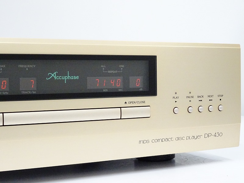 アキュフェーズのDP-430は、独自開発による、高剛性・高精度コンストラクションの『CD専用ドライブ』を搭載しています。静寂で気品漂うディスク・ローディング・メカは、高純度の信号読み取りを実現しています。プロセッサー部には、4個のDACを並列駆動した『MDS変換方式D/Aコンバーター』とフィルターアンプに新開発の『ANCC(Accuphase Noise and DistortionCancelling Circuit)』を搭載しています。トランスポート/ディジタル・プロセッサー部は独立。USB/同軸/オプティカルの各ディジタル入力とトランスポート出力端子が装備されています。