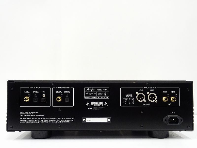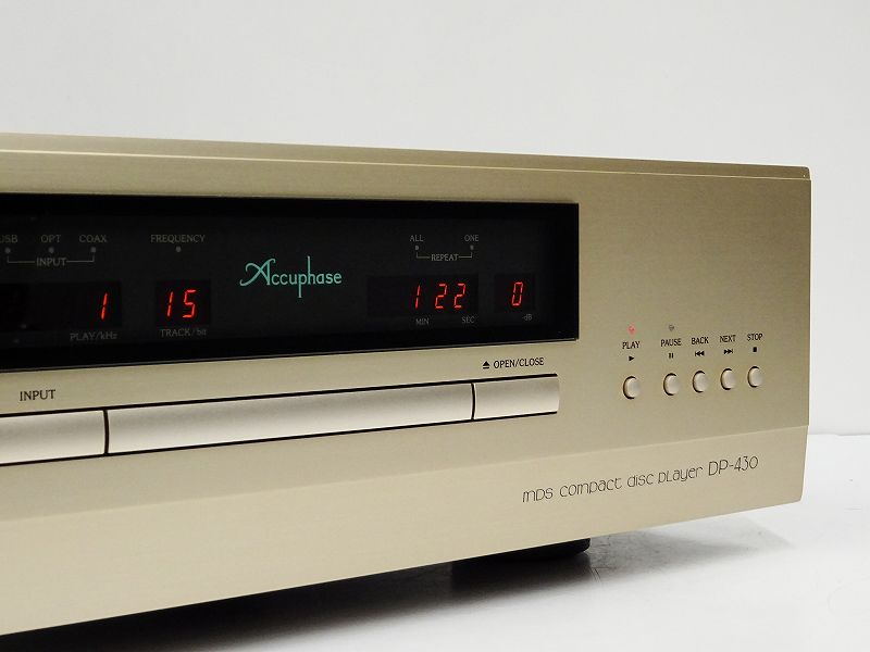 アキュフェーズのDP-430は、独自開発による、高剛性・高精度コンストラクションのCD専用ドライブを搭載したCDプレーヤーです。静寂で気品漂うディスク・ローディング・メカは、高純度の信号読み取りを実現しています。プロセッサー部には、4個のDACを並列駆動した「MDS変換方式D/Aコンバーター」とフィルターアンプに新開発の「ANCC(Accuphase Noise and DistortionCancelling Circuit)」を搭載しています。トランスポート/ディジタル・プロセッサー部は独立しています。USB/同軸/オプティカルの各ディジタル入力とトランスポート出力端子が装備されています。