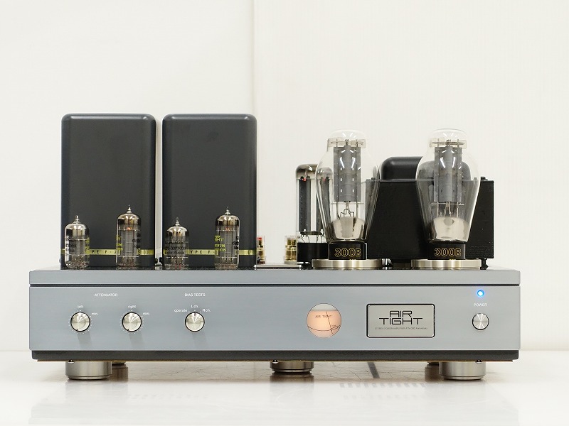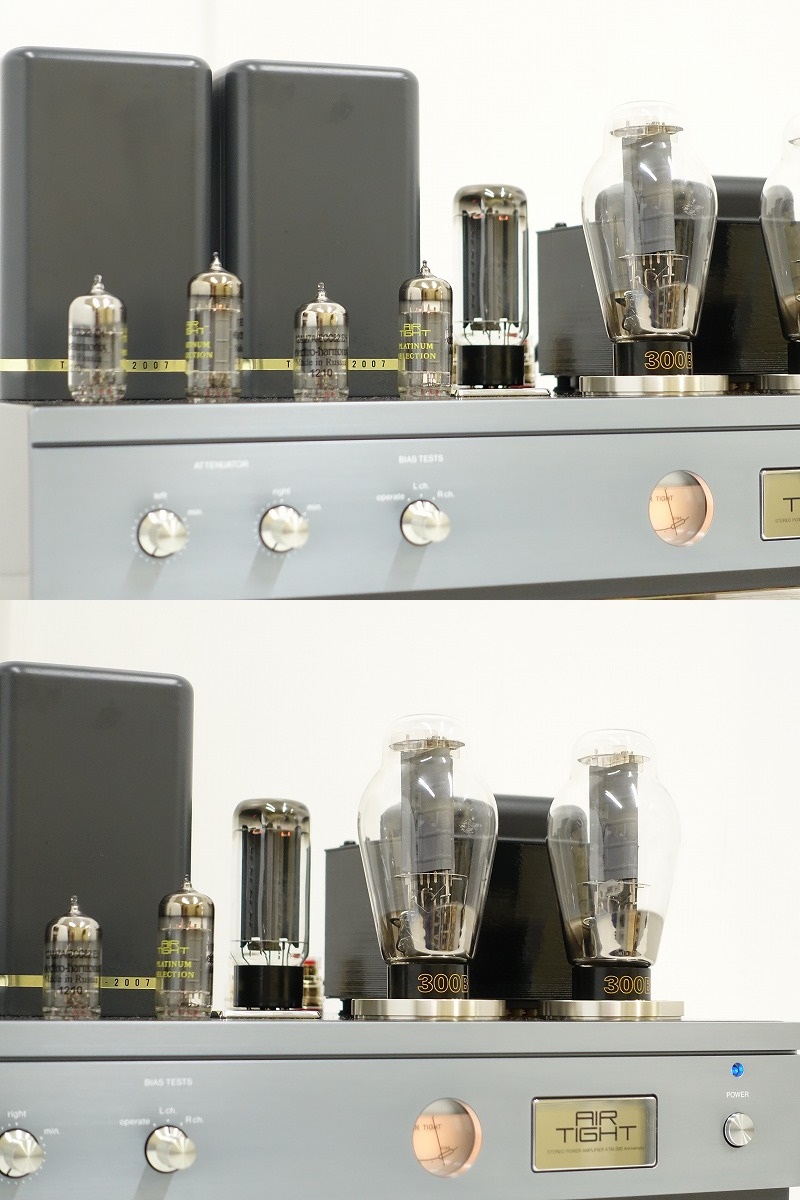 AIR TIGHT ATM-300 は、ウェスタン・エレクトリックの名球300Bを使用した管球式ステレオパワーアンプです。初段には12AU7(3極増幅管)をパラレル接続して使用しており、出力インピーダンスを低下させ、十分な電流を供給し、増幅率よりも低歪率を実現しています。ドライバー段は12BH7Aをパラレル接続で使用し、出力段では300Bは自己バイアスによる純A級動作としています。