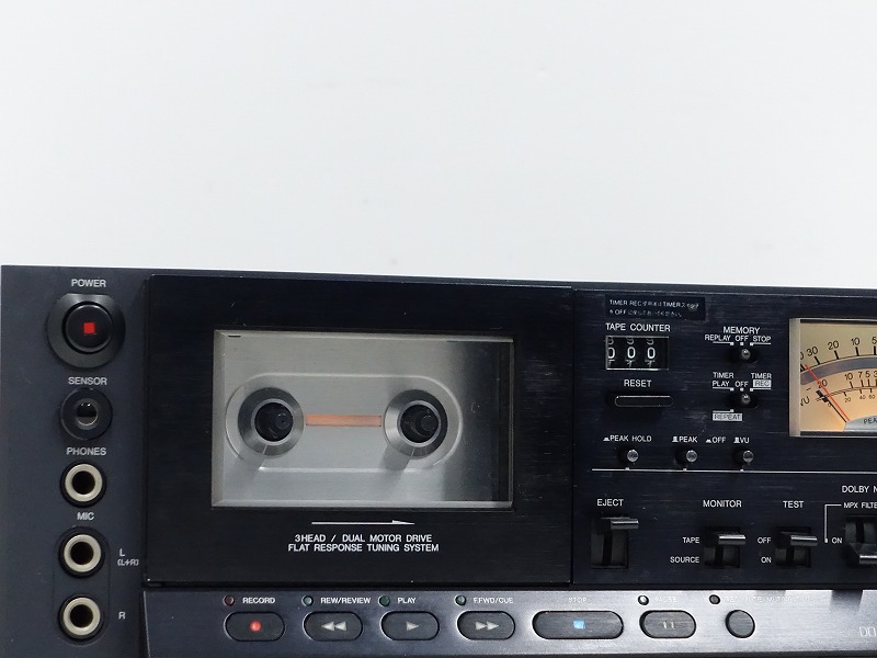 AIWA AD-F90Mは、メタルテープにも対応したカセットデッキです。ヘッド部には3ヘッドシステムをさらに発展させたCVC(コンビネーションV-Cut)3ヘッドシステムを使用しています。FRTS機構を搭載しています。テープごとにフラットな周波数特性を獲得するために、テスト信号を録音しながら同時再生し、バイアス量の微調整を行っています。