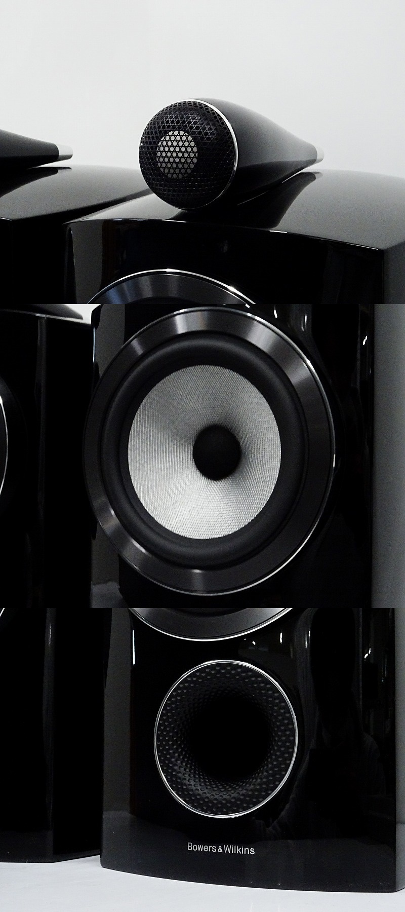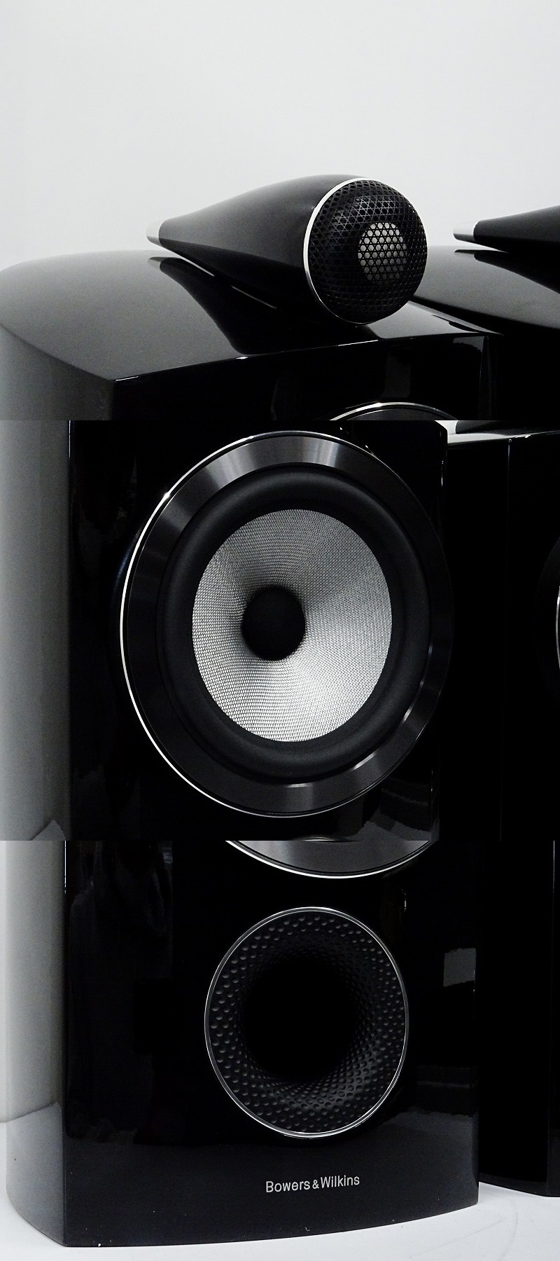 新開発のコンティニウムコーン・ユニットとダイアモンドツイーターを組み合わせた805 D3は、800シリーズで唯一のブックシェルフ型モデルです。フロア型でミッドレンジとして使っているユニットがウーファー帯域も受け持つという点は、従来までの800シリーズと同様です。コンティニウムコーンの素性が浮き彫りになる2ウェイ構成という点に加え、内部パネルの厚さを2倍に増やしたマトリックス構造も特徴です。
