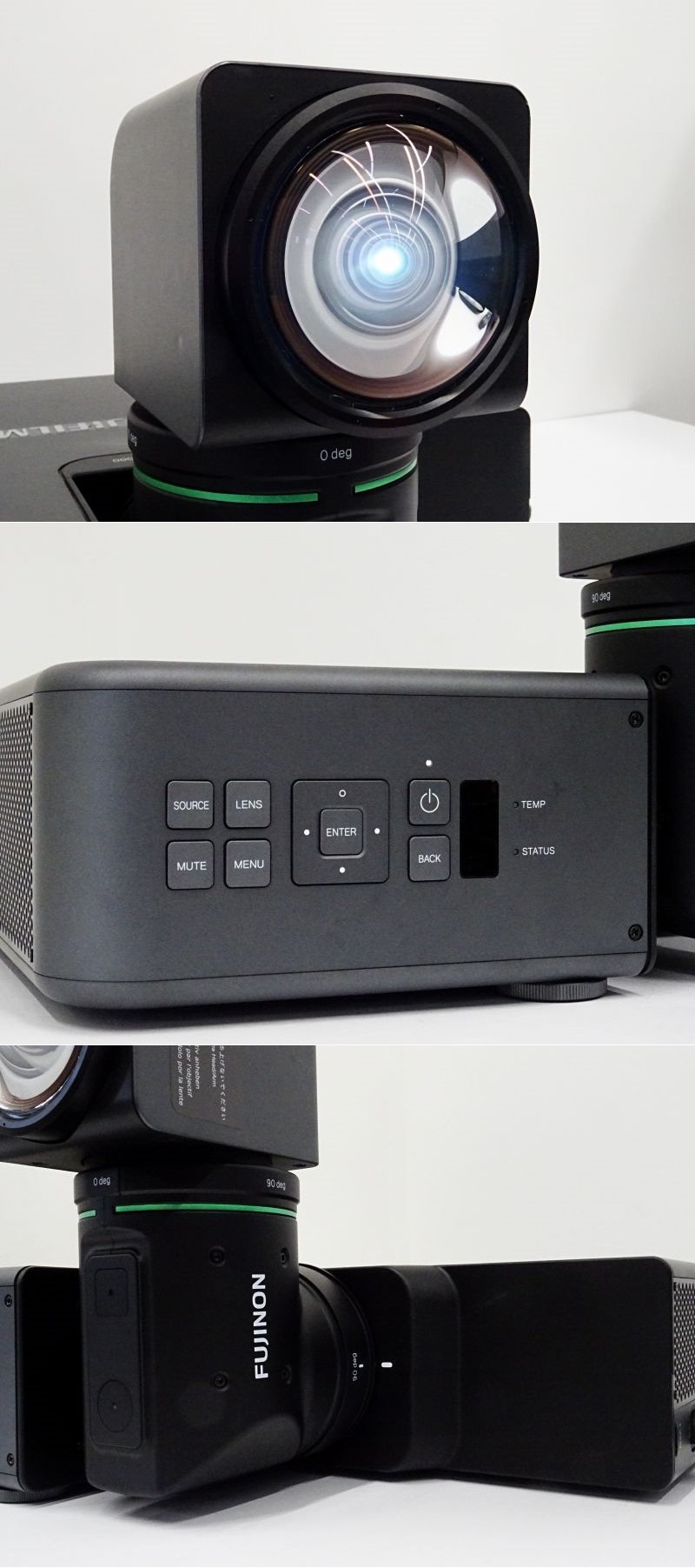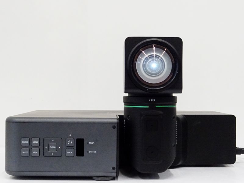FP-Z5000は、世界初の屈曲型二軸回転機構レンズを採用した業務用プロジェクターです。本体を動かさずにレンズを上・下・前・後・左・右に切り替え、さまざまな方向へ投写できるのが特徴です。壁やスクリーンのみならず、天井や床にも投写可能です。縦長映像を投写するポートレート投写もレンズの回転だけで行う事が出来ます。