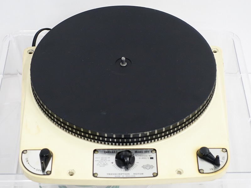 GARRARD MODEL 301は、LPレコード誕生の6年後にあたる1954年に発表されたガラード社のアイドラードライブ方式ターンテーブルです。強力な大型インダクションモーターを採用し、その振動を軽減するオリジナルのサスペンション機構やエディカレントブレーキによる回転数微調整機構、さらにダイナミックバランス調整が慎重に装備されたアルミダイキャスト製プラッターの搭載などが特徴です。