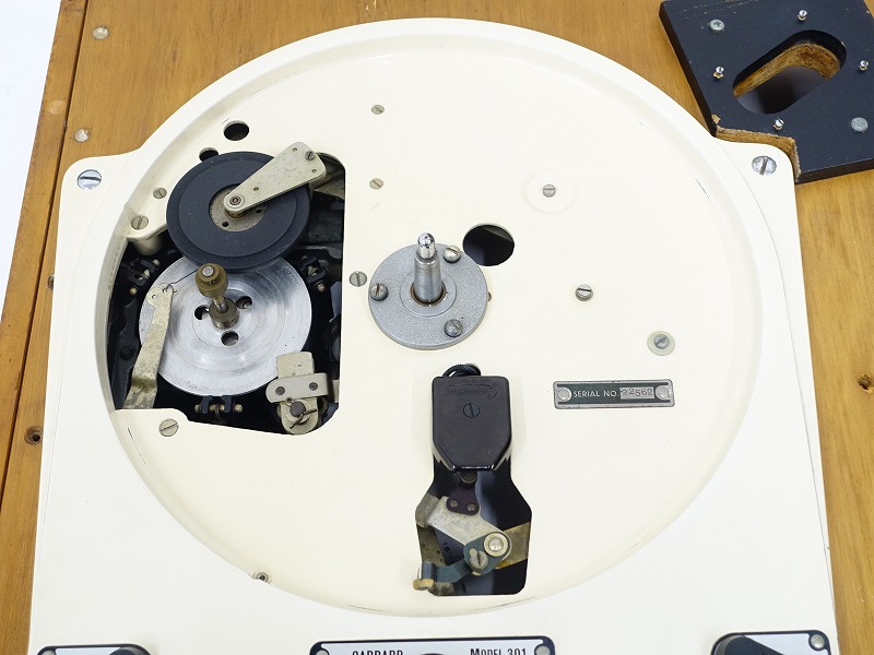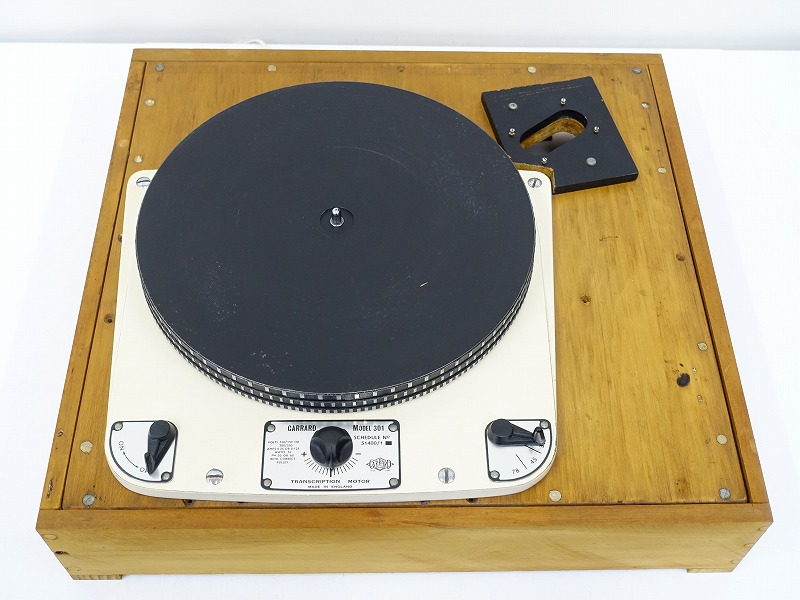 GARRARD MODEL 301は、LPレコード誕生の6年後にあたる1954年に発表されたガラード社のアイドラードライブ方式ターンテーブルです。強力な大型インダクションモーターを採用し、その振動を軽減するオリジナルのサスペンション機構やエディカレントブレーキによる回転数微調整機構、さらにダイナミックバランス調整が慎重に装備されたアルミダイキャスト製プラッターの搭載などが特徴です。