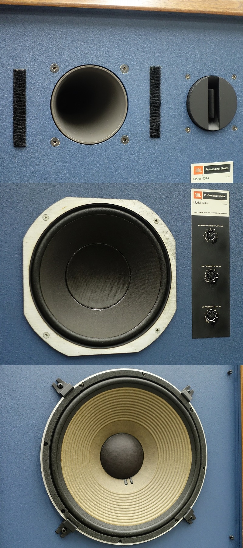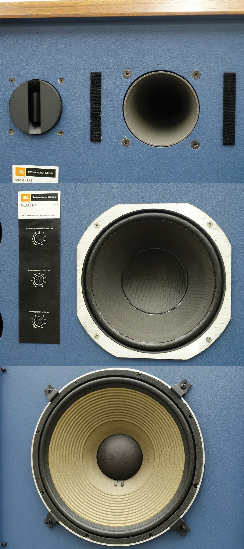 JBL 4344は、1982年~1983年の前期までと1983年以降の後期とで一部の使用されているユニットが変わります。中高域のドライバーユニットは前期は2421B、後期は2425Jが使用されています。また、高域のホーン型ツイーターは前期は2405、後期は2405Hが使用されています。