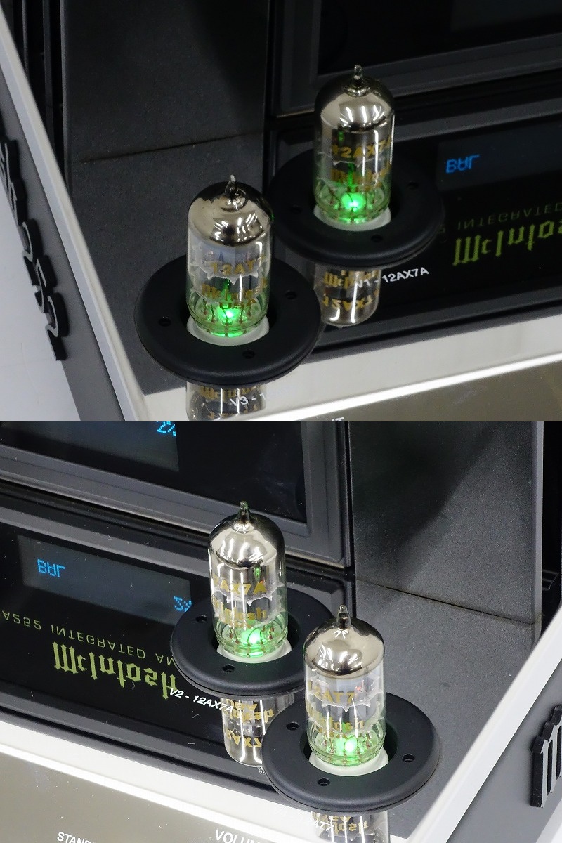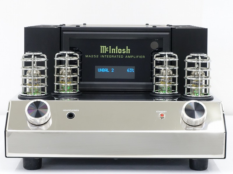 McIntosh MA252は真空管とソリッドステート回路を組み合わせたプリメインアンプです。斬新な外観デザインをまとい、高音質を実現しています。プリアンプ部は、12AX7a x 2本と12AT7 x 2本の真空管回路で構成されています。そしてこれらの真空管は保護ケージに収められています。最大出力は100W+100W(8Ω)、160W+160W(4Ω)です。