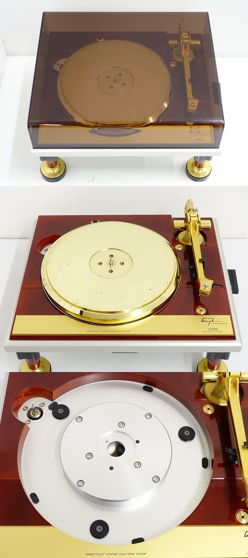 Σ5000は、寺垣氏がセイコーエプソンとの協同作業によって製品化したレコードプレーヤーです。レコードプレーヤーとしてだけでなく、正確な読み取り機としての性能を実現しています。構造は、軸受けの主軸が4枚の円板に寄り掛かるようになっており、軸受のクリアランスが常時0となるように作動します。
