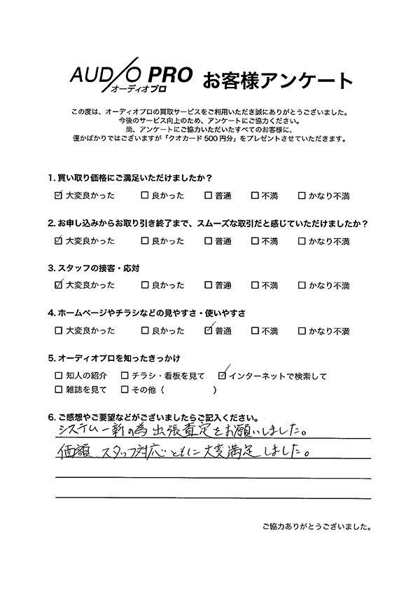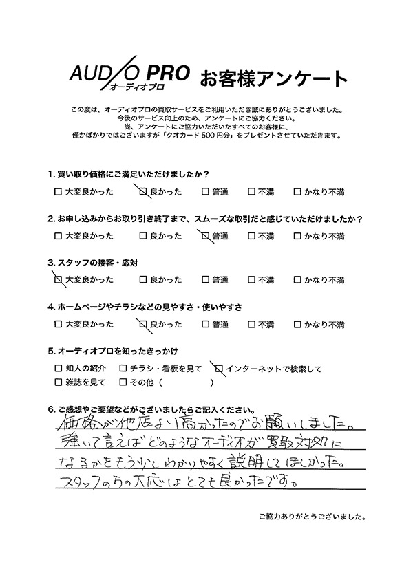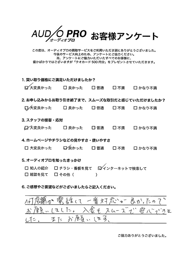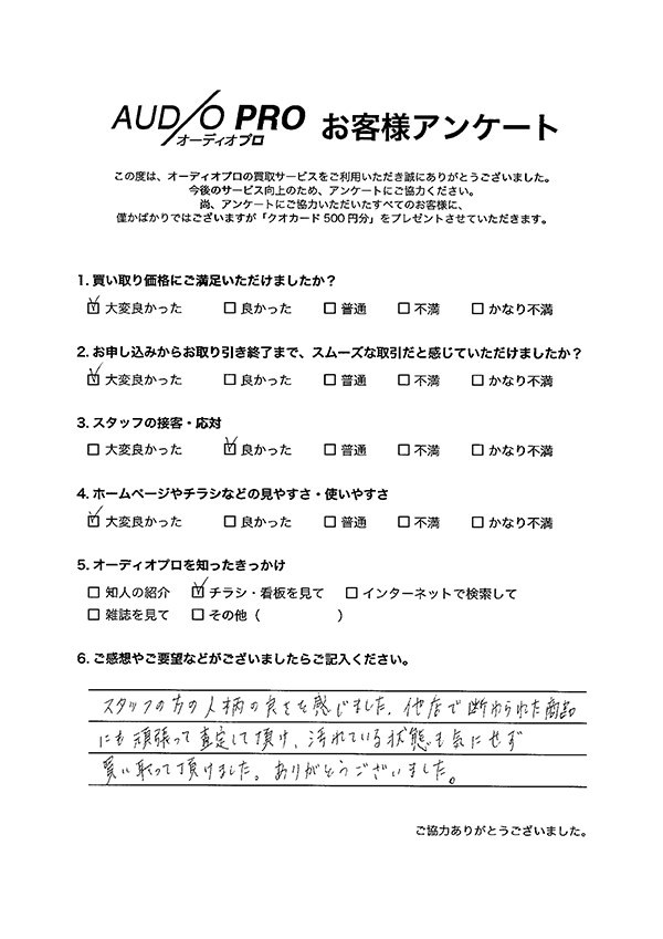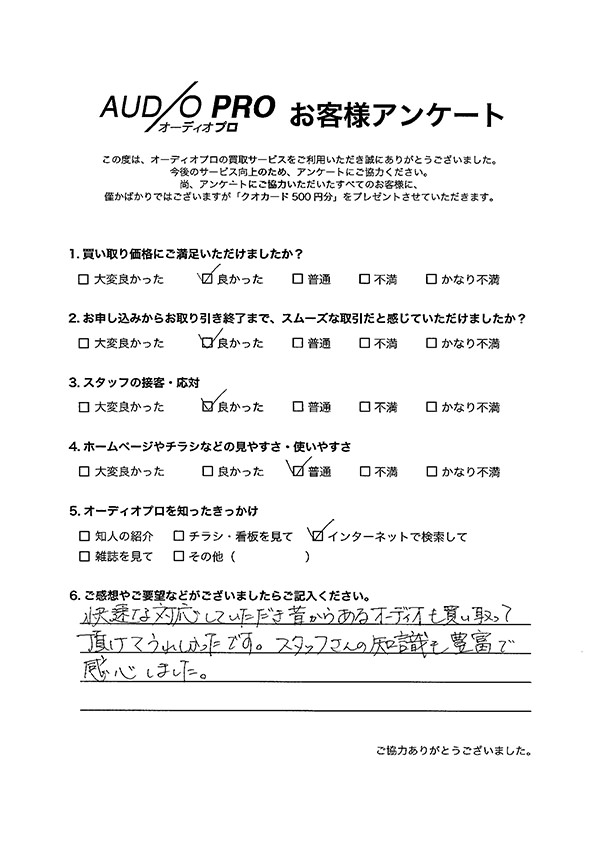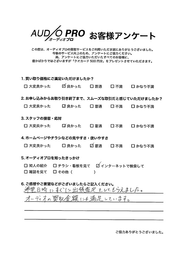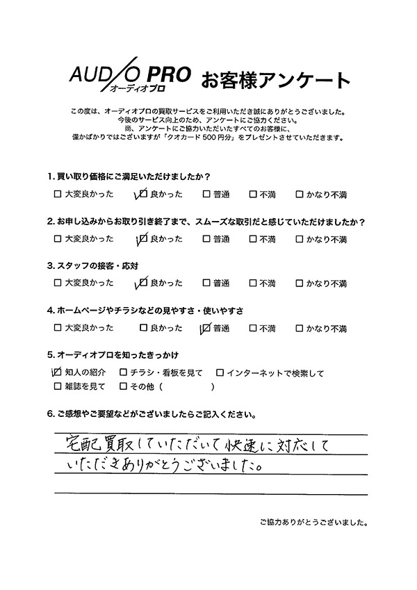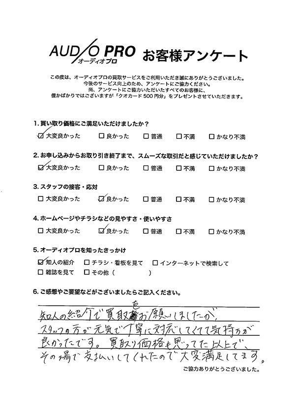 オーディオプロでは、買取のご依頼をされたお客様を対象に、アンケートのお願いを実施しております。 アンケートにお答えいただきましたお客様には「Quoカード500円分」をプレゼントしております。 その中から、いくつかお客様の声をご紹介させていただきます。